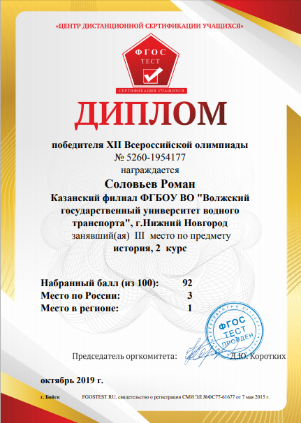 | Тип | Достижение | Описание: ЦЕНТР ДИСТАНЦИОННОЙ СЕРТИФИКАЦИИ УЧАЩИХСЯ ДИПЛОМ победителя XII Всероссийской олимпиады награждается Соловьев Роман Казанский филиал ФГБОУ ВО "Волжский государственный университет водного транспорта", г. Казань занявший(ая) III место по предмету история, 2 курс Набранный балл (из 100): 92 Место по России: 3 Место в регионе: 1 |