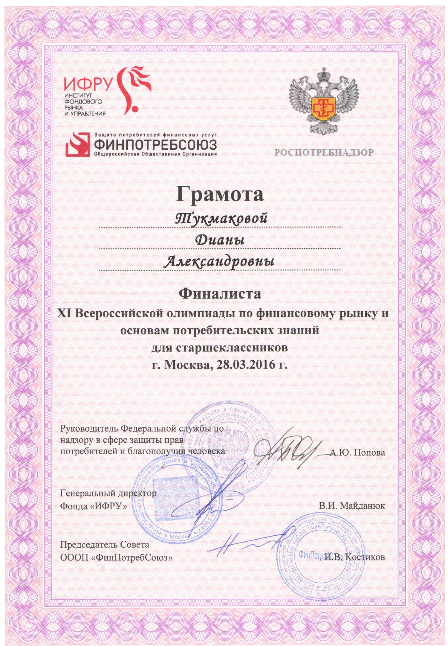 Финалист XI Всероссийской олимпиады по финансовому рынку и основам потребительских знаний (г.Москва)