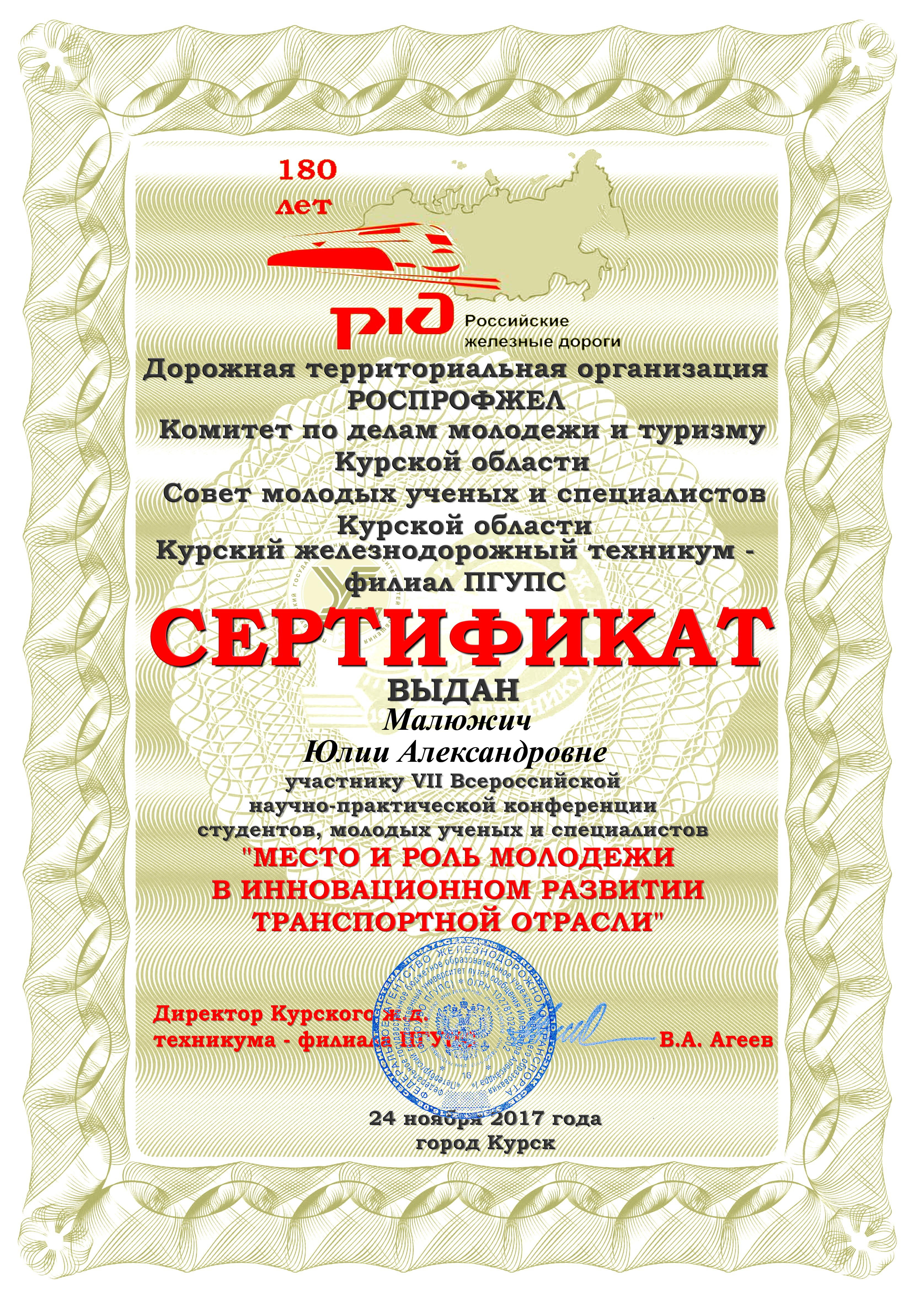 Сертификат участника в VII научно-практической конференции студентов, молодых ученых и специалистов "Место и роль молодежи в инновационном развитии транспортной отрасли"