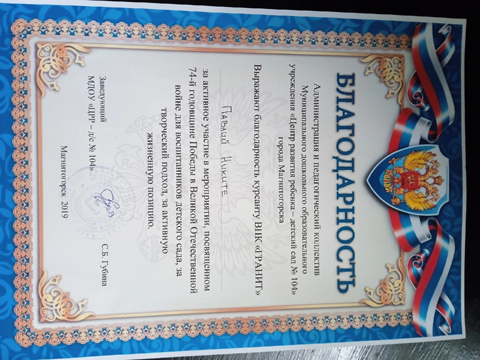 | Тип | Достижение | Описание: За активное участие в мероприятии, посвященном 74-й годовщине Победы в Великой Отечественной войне, для воспитанников детского сада, за творческий подход, за активную жизненную позицию, курсанту ВПК"Гранит" Павлий Никите. От МДОУ "ЦРР-д/с 104" |