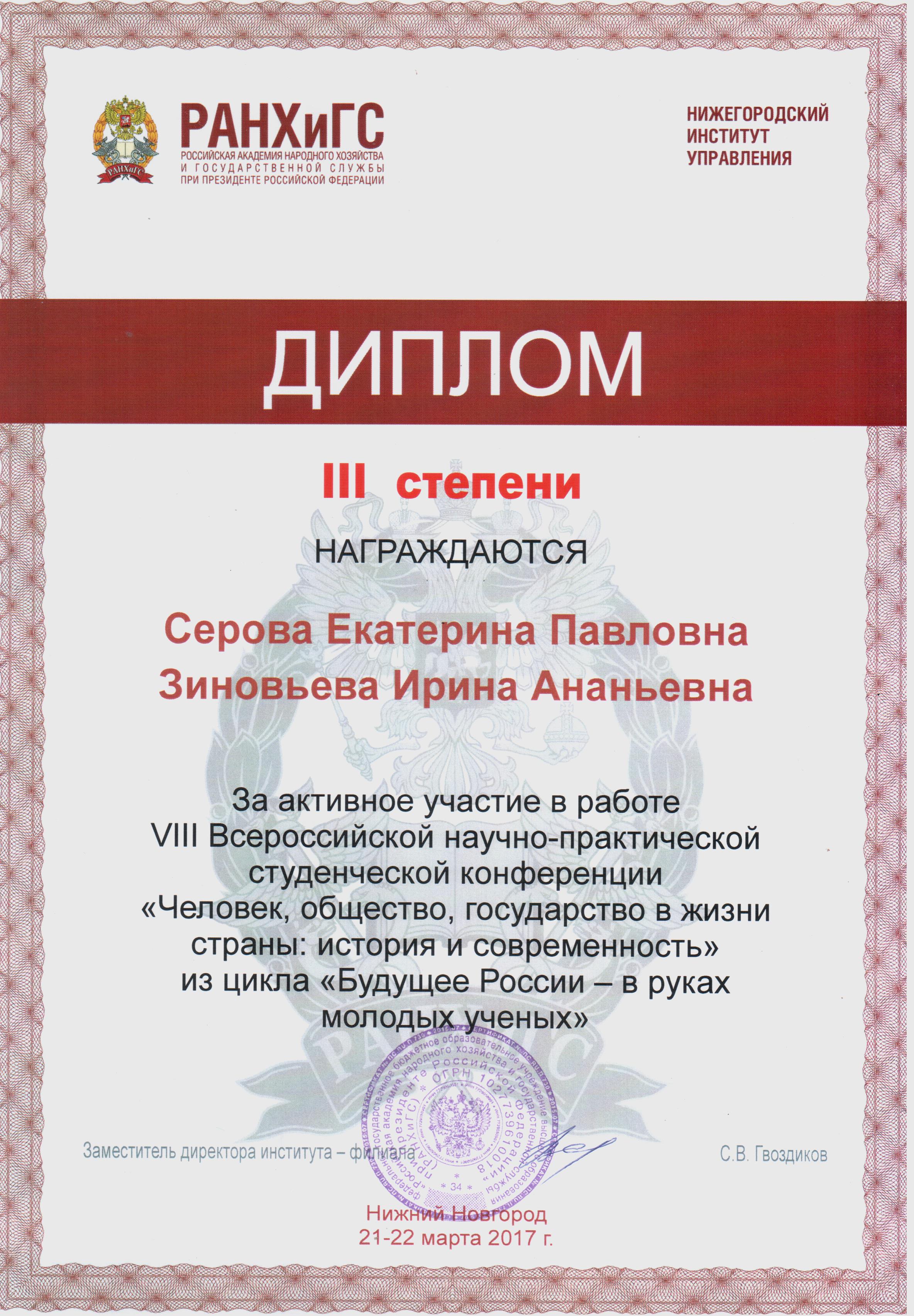| Тип | Достижение | Описание: Награждена дипломом III степени За активное участие в работе VIII Всероссийской научно-практической конференции "Человек, общество, государство в жизни страны: история и современность" из цикла "Будущее России - в руках молодых учёных" 21-22 марта |
