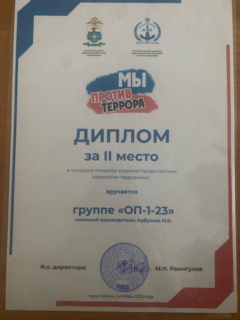 | Тип | Достижение | Описание: настоящий диплом выдан групе «ОП-1-23», классный руководитель: Арбузова М.В. отдела среднего профессионального образования в том, что курсанты группы 09 октября 2023 г. были причислены к славному братству российских специалистов речного и морского флота |
