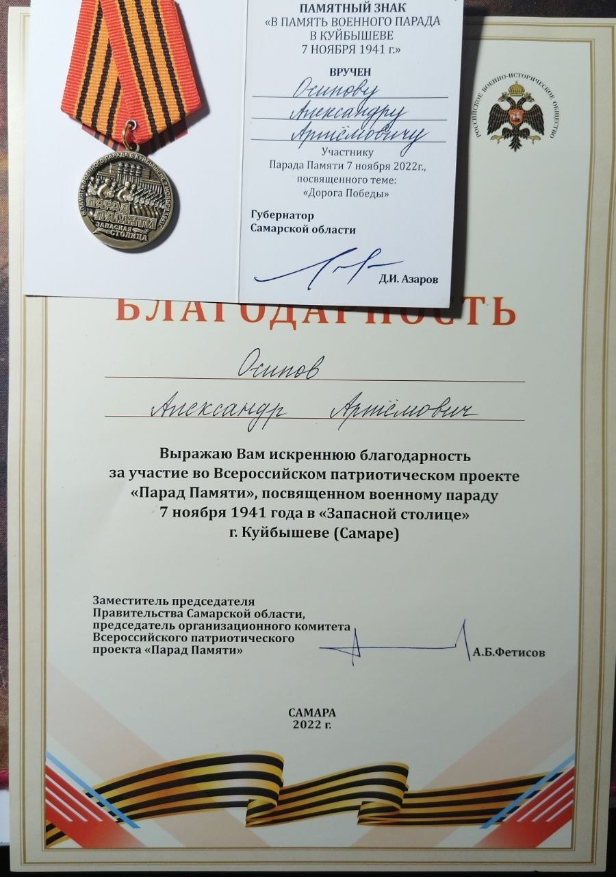 | Тип | Достижение | Описание: За участие в международном патриотическом проекте "Парад Памяти", посвященному военному параду 7 ноября 1941 года в городе Куйбышеве – «запасной столице» СССР в годы Великой Отечественной войны. Прохождение в составе парадного расчета Самарского филиала ВГУВТ по площади Куйбышева на Параде Памяти - « Дорогой победы» |