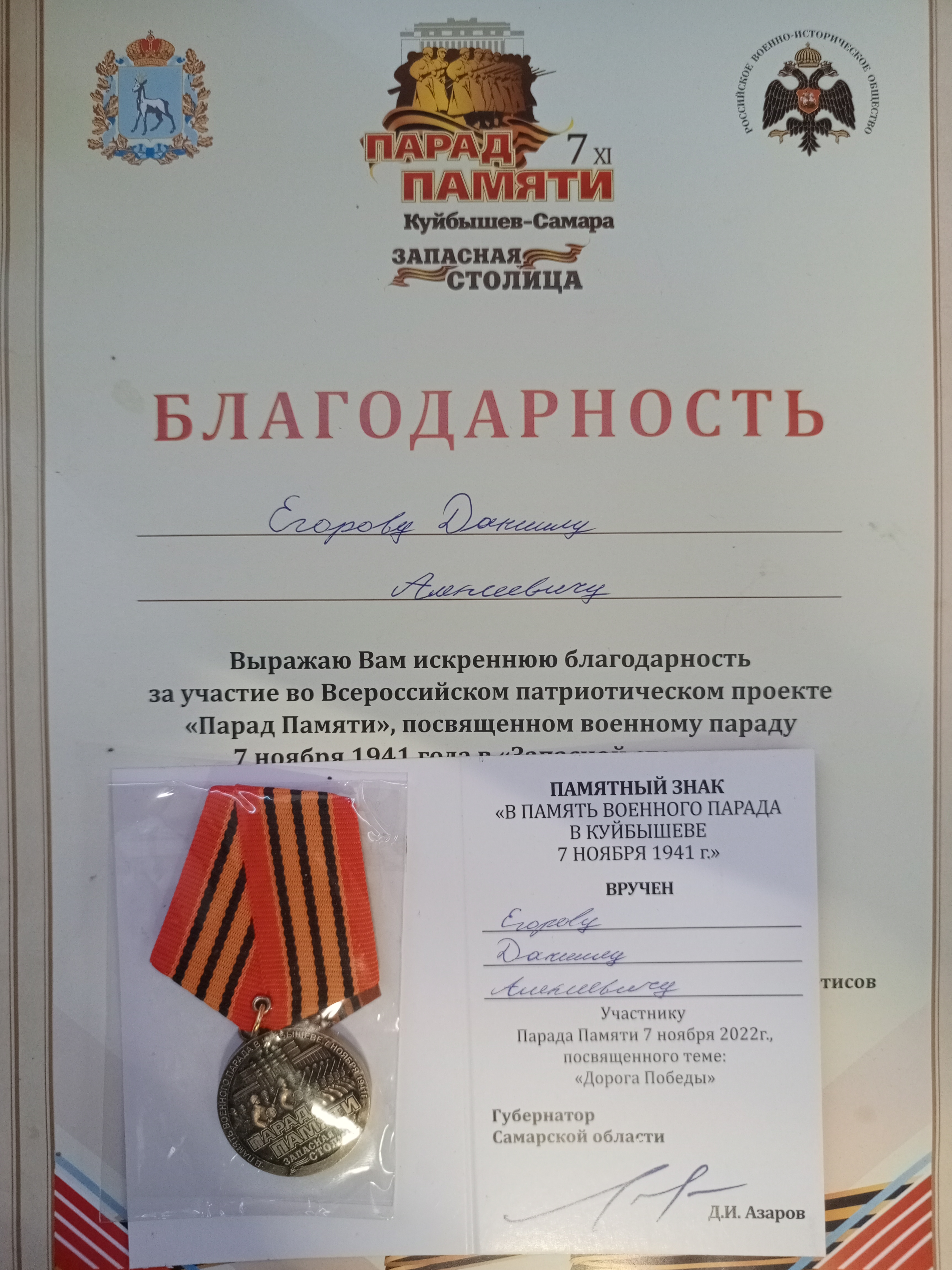 | Тип | Достижение | Описание: За участие в международном патриотическом проекте "Парад Памяти", посвященному военному параду 7 ноября 1941 года в городе Куйбышеве – «запасной столице» СССР в годы Великой Отечественной войны. Прохождение в составе парадного расчета Самарского филиала ВГУВТ по площади Куйбышева на Параде Памяти - « Дорогой победы» |