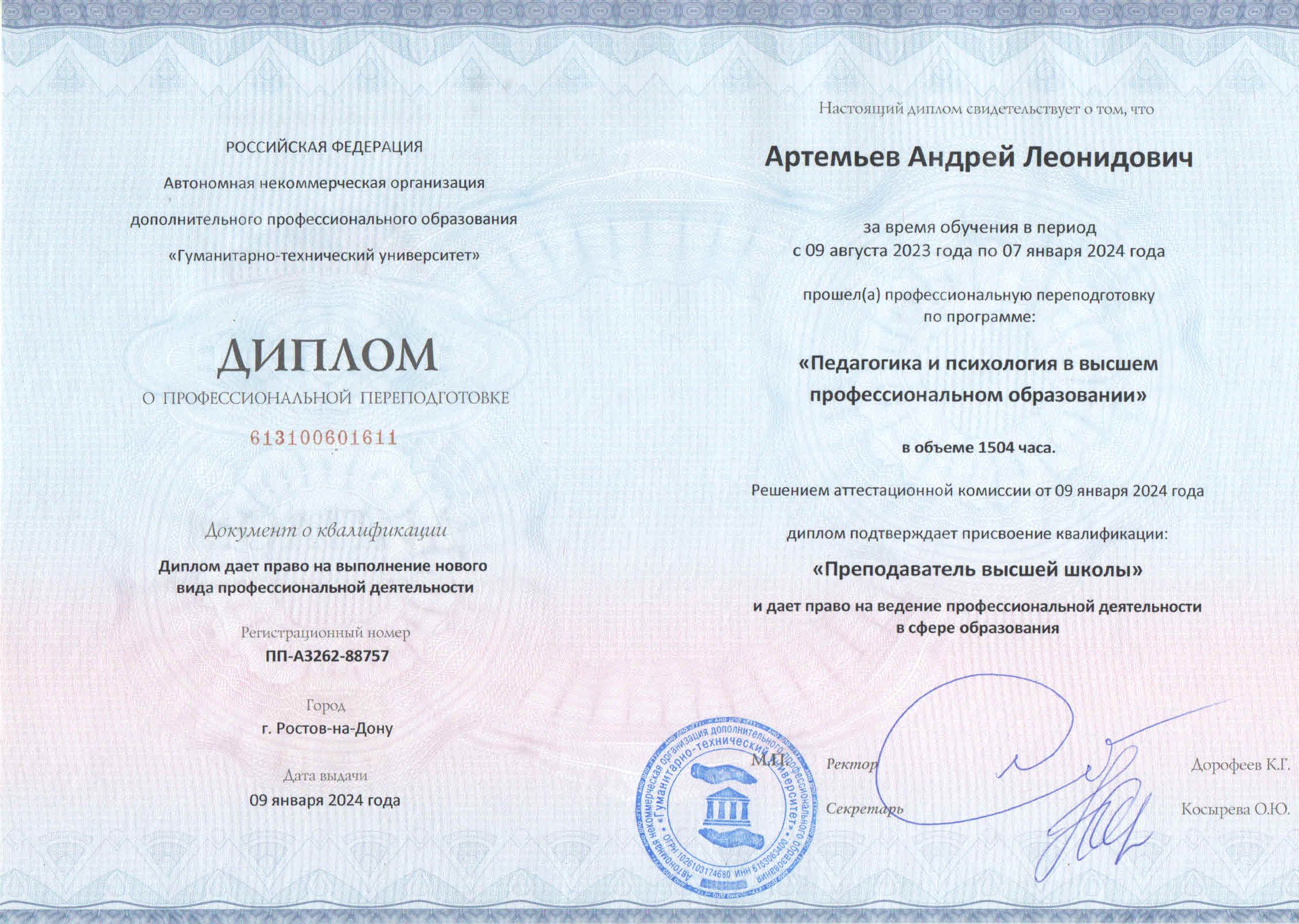 | Тип | Достижение | Описание: Педагогика и психология в высшем профессиональном образовании, Преподаватель высшей школы, 1504 часа, Автономная некоммерческая организация дополнительного профессионального образования "Гуманитарно-технический университет" (Ростов-на-Дону) |
