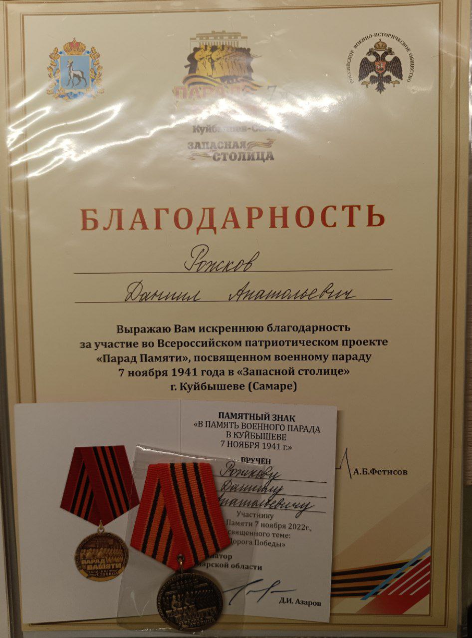 | Тип | Достижение | Описание: За участие в международном патриотическом проекте "Парад Памяти", посвященному военному параду 7 ноября 1941 года в городе Куйбышеве – «запасной столице» СССР в годы Великой Отечественной войны. Прохождение в составе парадного расчета Самарского филиала ВГУВТ по площади Куйбышева на Параде Памяти - « Дорогой победы» |