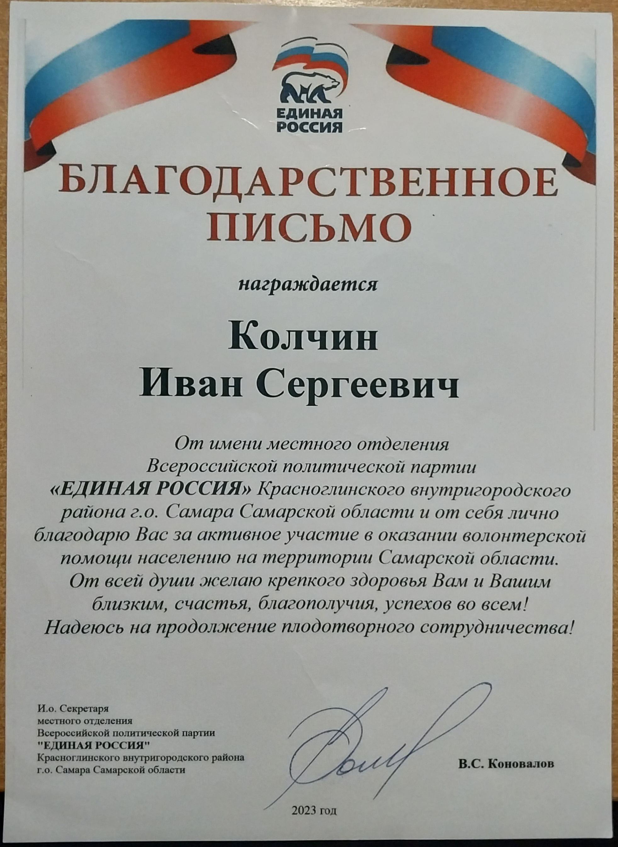 | Тип | Достижение | Описание: награждается Колчин И.С. от имени отделения Всероссийской полит. партии "ЕДИНАЯ РОССИЯ" Красноглинского внутрегородского района г.о Самара Самарской области и от себя лично благодарю Вас за активное участие в оказании волонтёрской помощи населению на территории Самарской области. |