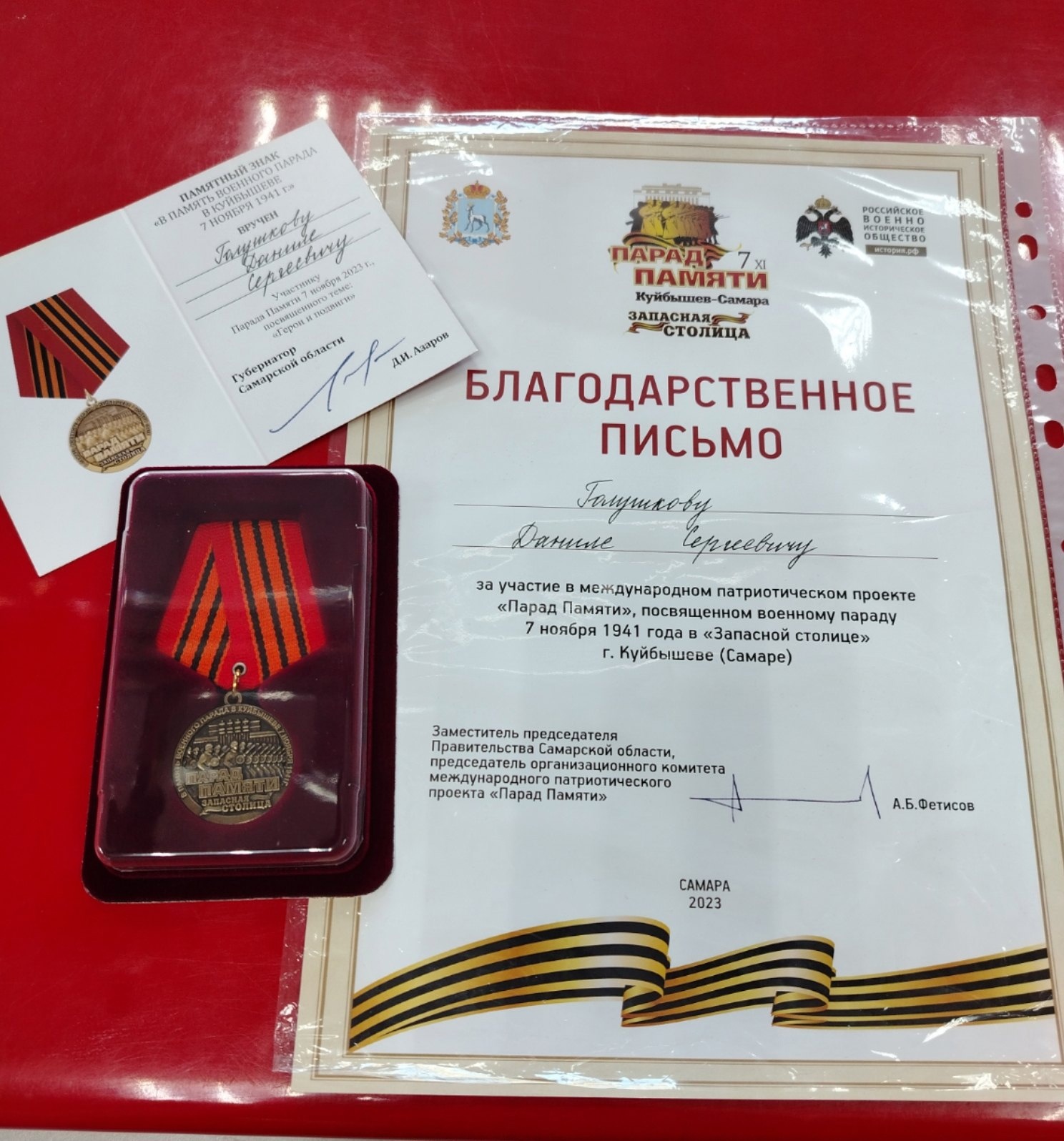 | Тип | Достижение | Описание: Участие в международном патриотическом проекте "Парад Памяти", посвященному военному параду 7 ноября 1941 года в городе Куйбышеве – «запасной столице» СССР в годы Великой Отечественной войны Прохождение в составе парадного расчета Самарского филиала ВГУВТ по площади Куйбышева на Параде Памяти - «Герои и подвиги». |