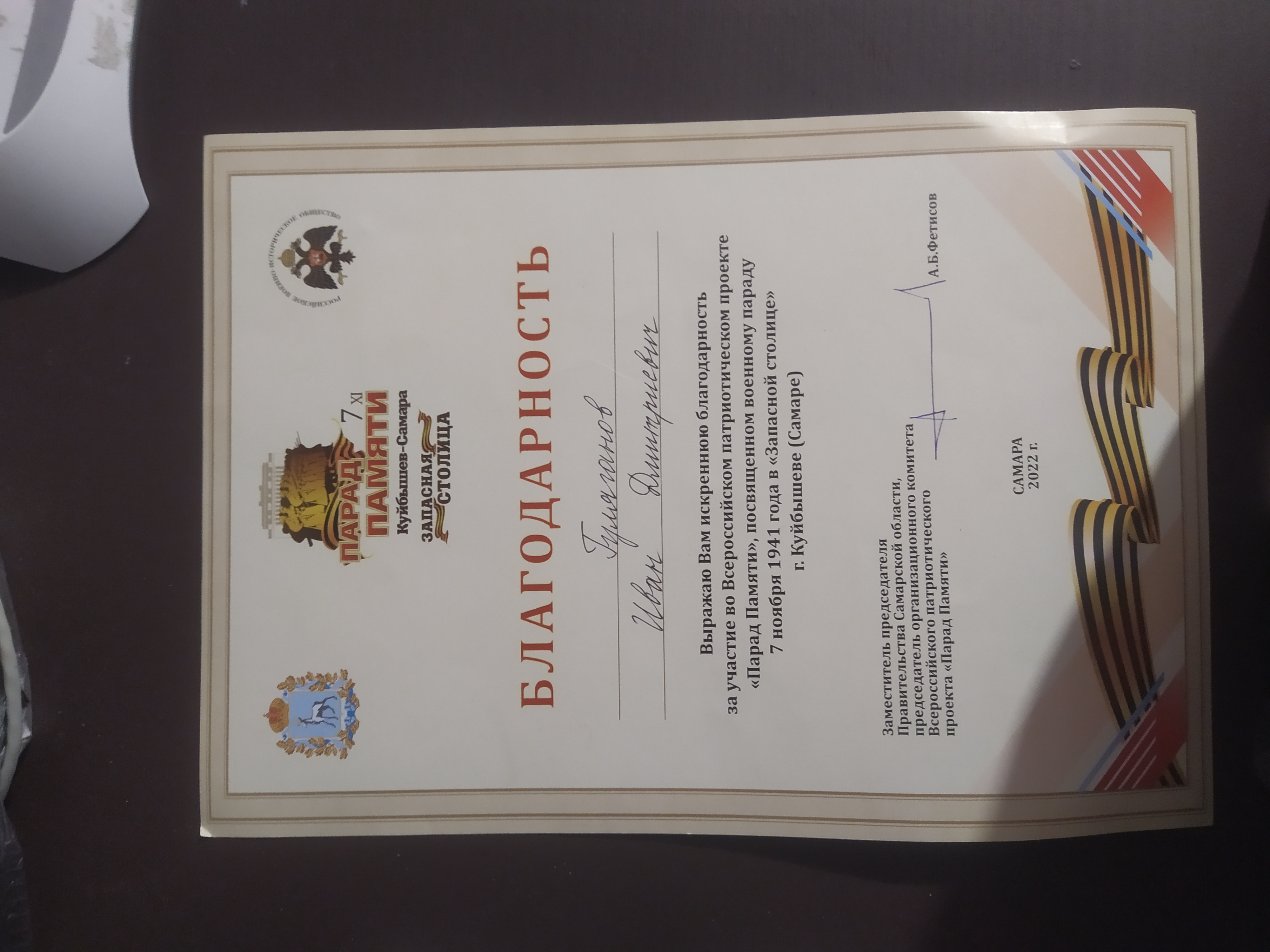 | Тип | Достижение | Описание: За участие в международном патриотическом проекте "Парад Памяти", посвященному военному параду 7 ноября 1941 года в городе Куйбышеве – «запасной столице» СССР в годы Великой Отечественной войны. Прохождение в составе парадного расчета Самарского филиала ВГУВТ по площади Куйбышева на Параде Памяти - « Дорогой победы» |