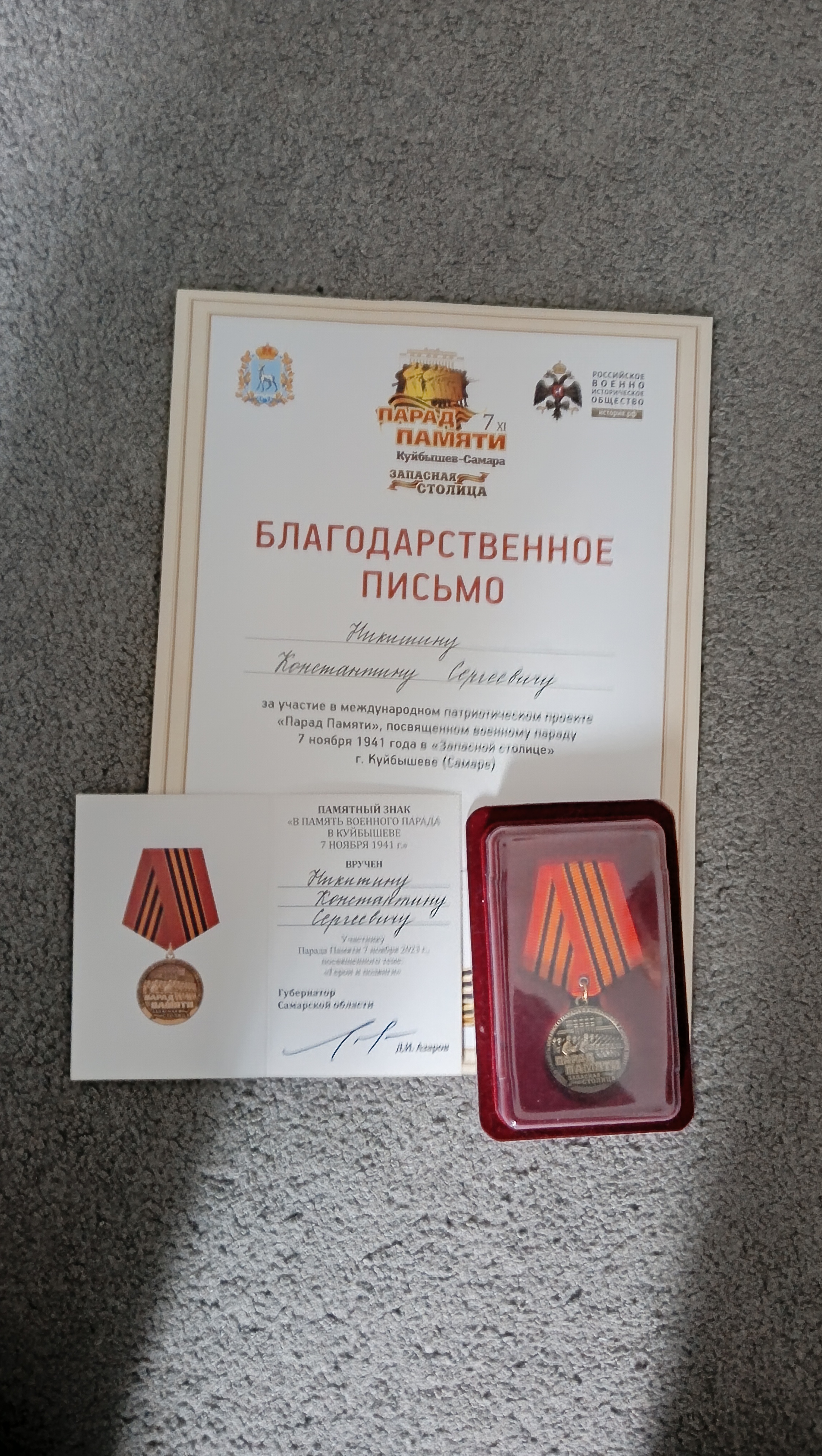 Благодарственное письмо, памятный знак и удостоверение