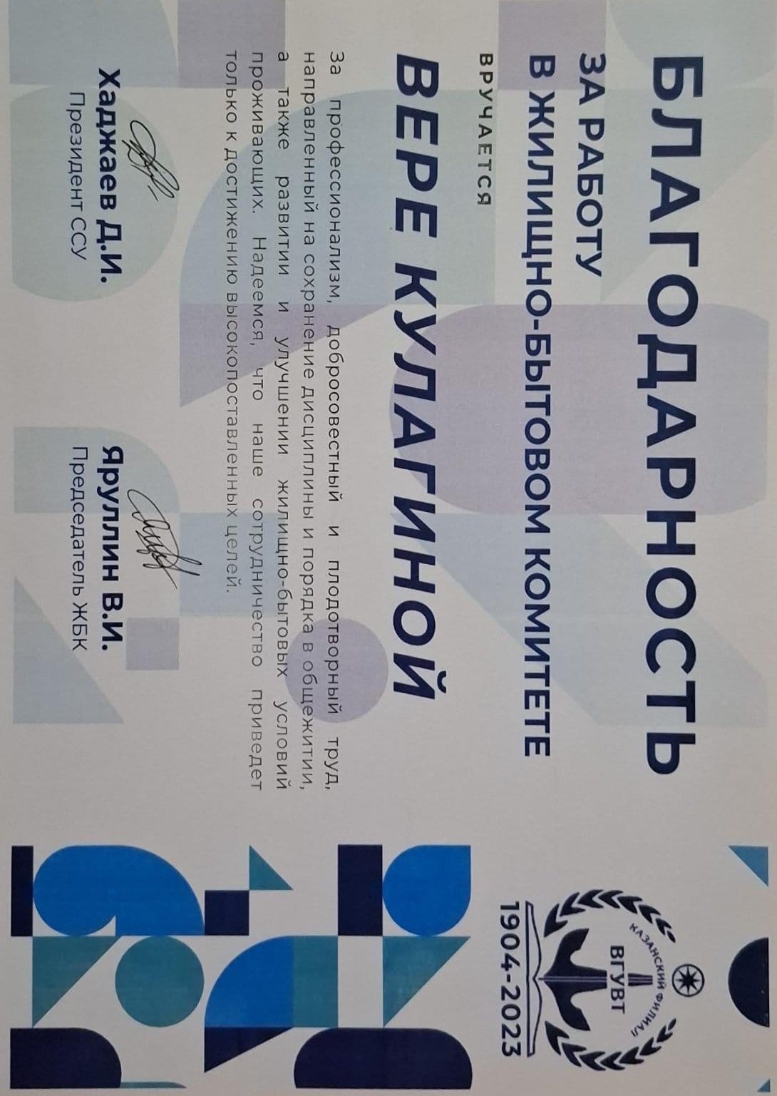 Благодарность за работу в Жилищно-бытовом комитете