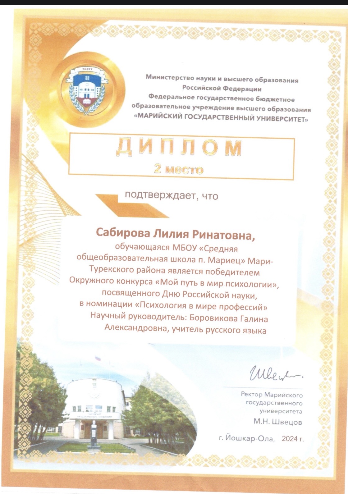 | Тип | Достижение | Описание: являюсь победителем Окружного конкурса «Мой путь в мир психологии», посвященного Дню Российской науки, в номинации «Психология в мире профессий» Научный руководитель: Боровикова Галина Александровна, учитель русского языка |