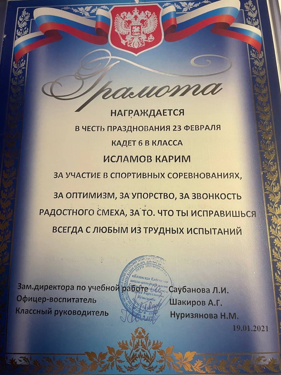 | Тип | Достижение | Описание: Награждается в честь празднования 23 февраля кадет 6в класса Исламов Карим за участие в спортивных соревнованиях, за оптимизм, за упорство, за звонкость радостного смеха. за то что ты справишься всегда с любым из трудных испытаний |