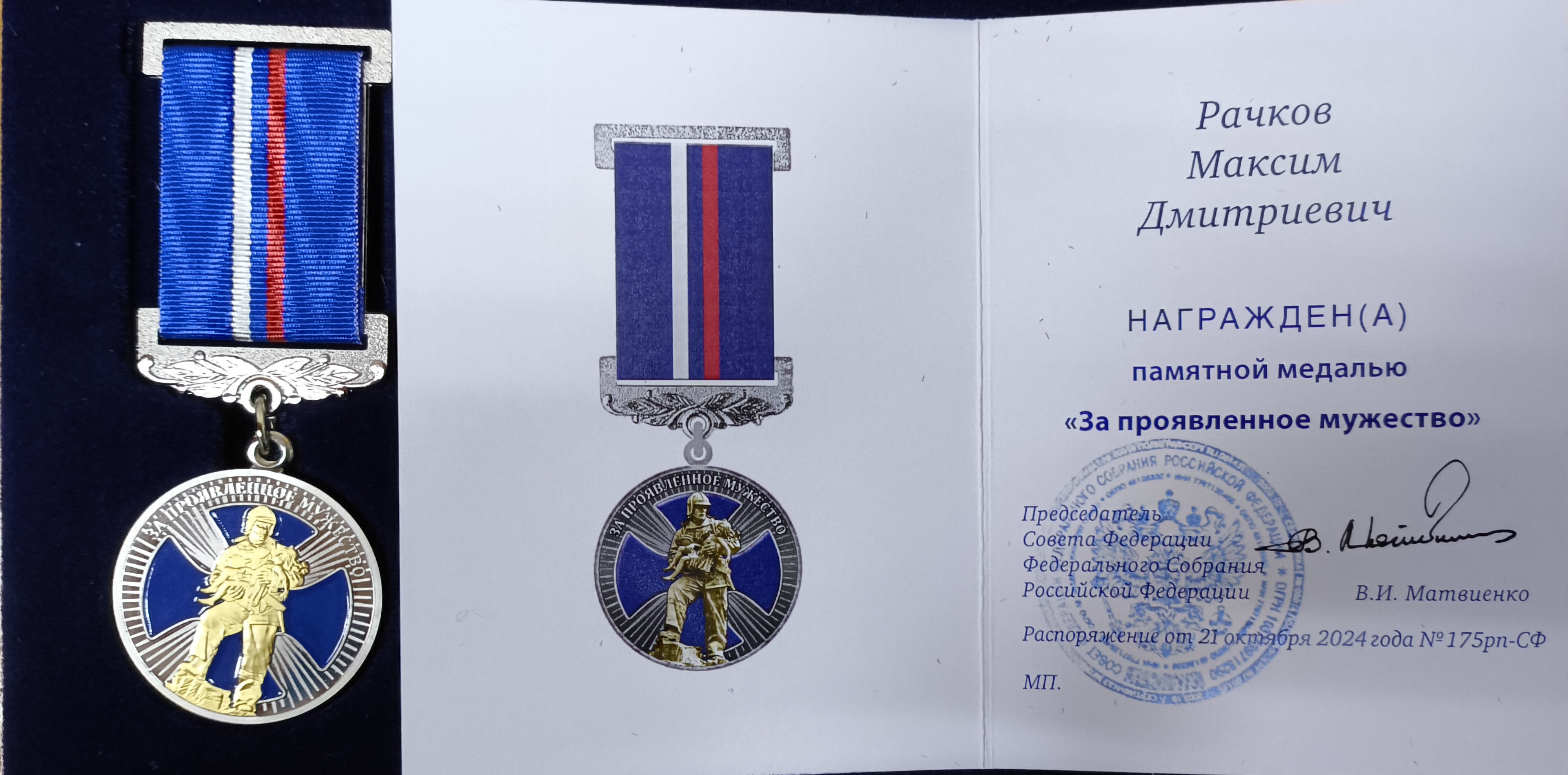 | Тип | Достижение | Описание: Почётная награда Главного управления МЧС России по Республике Татарстан «За проявленное мужество». Эта высокая награда вручена за героизм и самоотверженность во время трагического крушения пассажирского поезда «Казань-Адлер», которое произошло 29 июля 2024 года. |