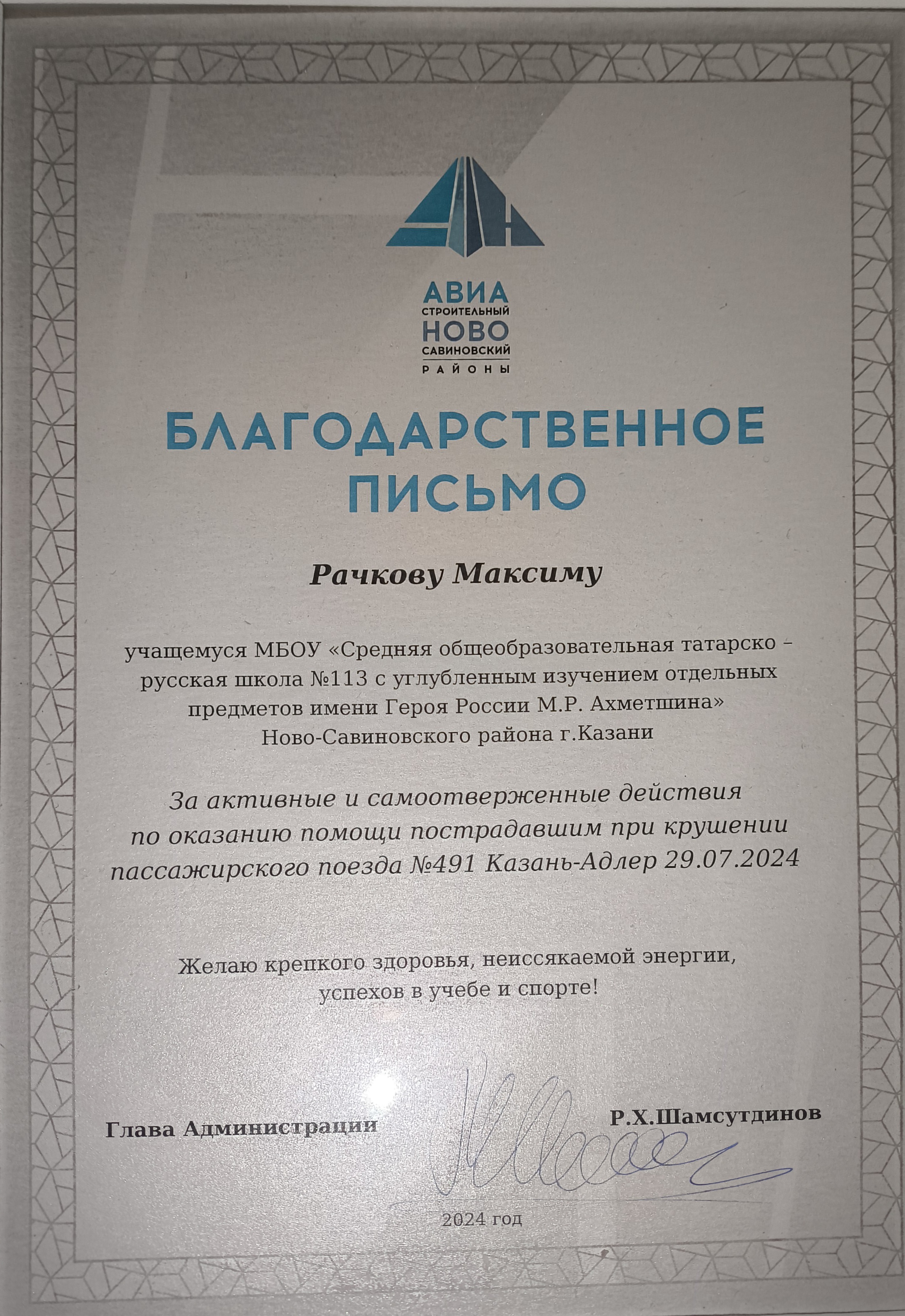 | Тип | Достижение | Описание: Благодарственное письмо от главы Администрации Ново-Савиновского и Авиастроительного района, за активные и самоотверженные действия по оказанию помощи пострадавшим при крушении пассажирского поезда "Казань-Адлер". |