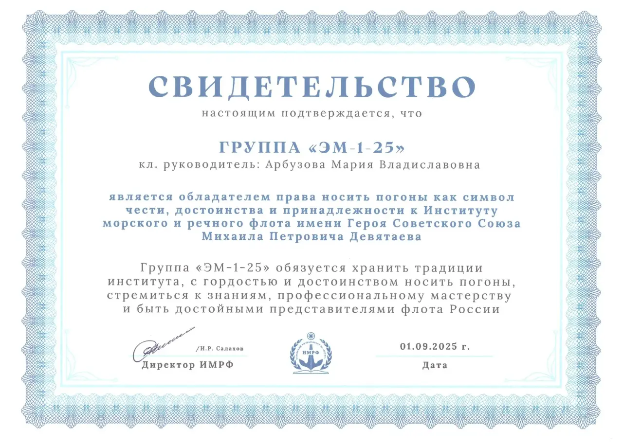 | Тип | Достижение | Описание: является обладателем права носить погоны как символ чести, достоинство и принадлежности к Институту морского и речного флота имени Героя Советского Союза Михаила Петровича Девятаева Группа «ЭМ-1-25» обязуется хранить традиции института, с гордостью и достоинством носить погоны, стремиться к знаниям, профессиональному мастерству и быть достойными представителями флота России |