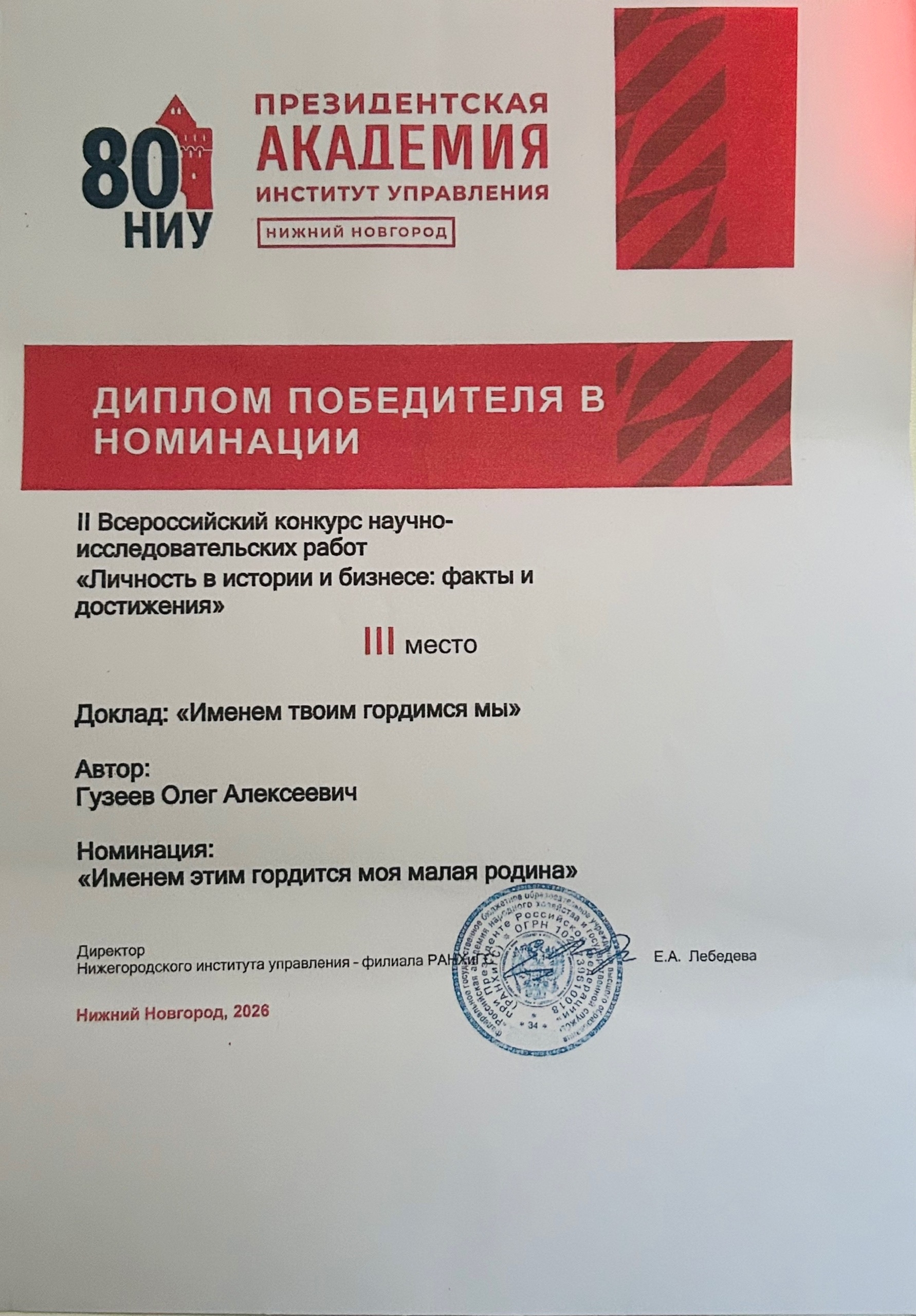 | Тип | Достижение | Описание: По итогам участия во II Всероссийском конкурсе научно-исследовательских работ на тему: "Личность в истории и бизнесе: факты и достижения" , студент Гузеев Олег группы С-412 получил диплом 3 места за доклад "Именем твоим гордимся мы" в номинации "Именем этим гордится моя малая родина", а его руководитель Клячкина Н.Л., педагог-психолог - отмечена Благодарственным письмом. |