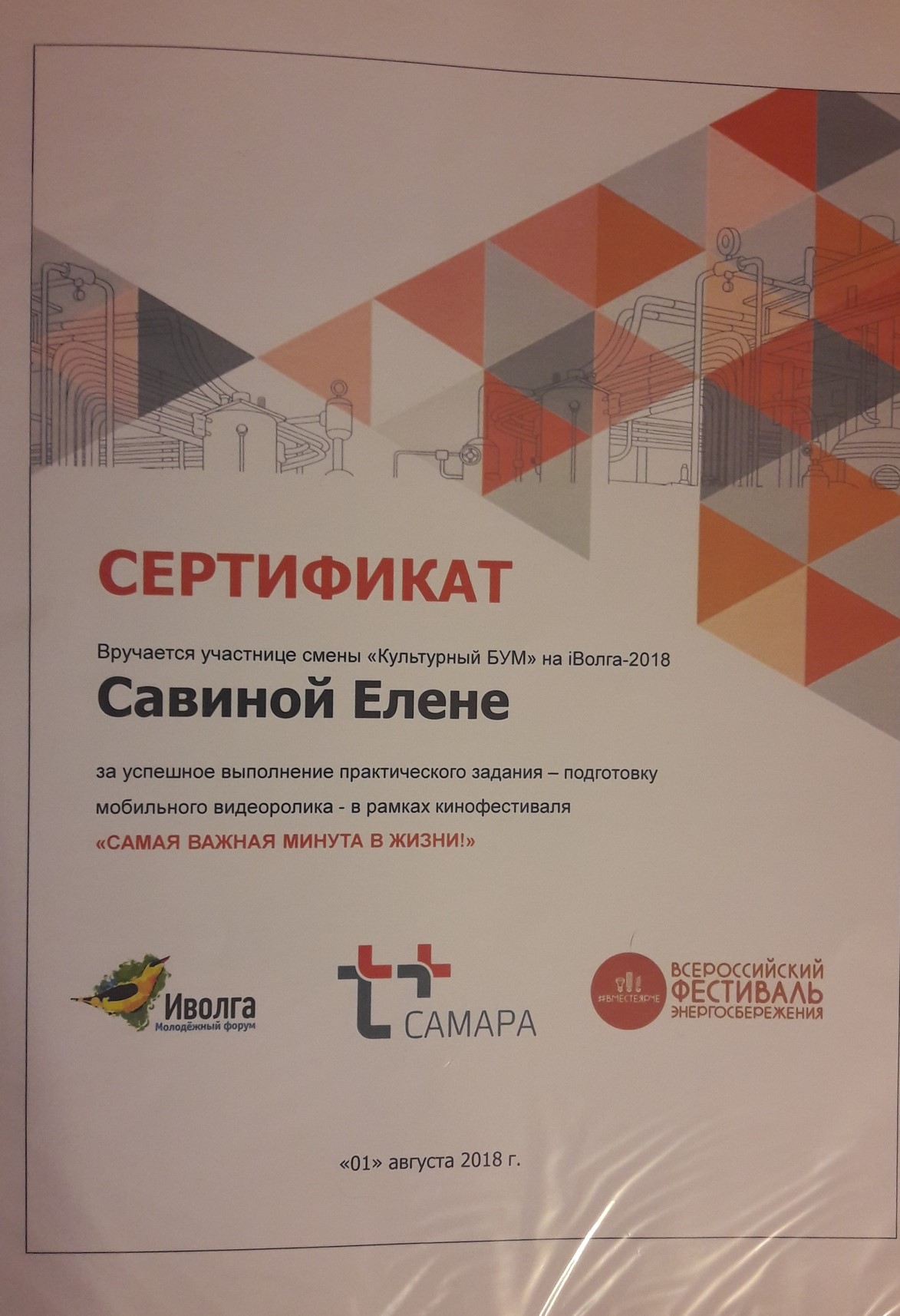 | Тип | Достижение | Описание: мобильный видеоролие в рамках кинофестиваля "Самая важная минута в жизни!" Снимали фильм на заданную тематику и жанр, жанр: комедия; тематика: неоплаченные счета за коммунальные услуги, принимала участие в качестве декоратора. |