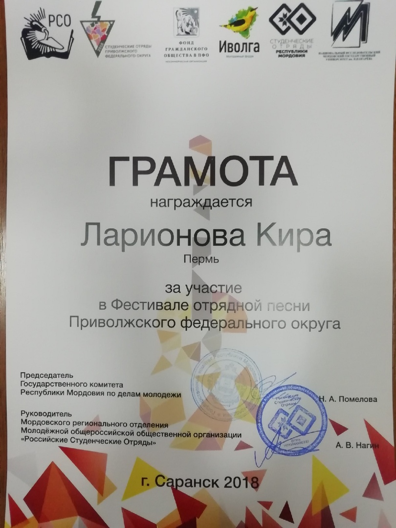 | Тип | Достижение | Описание: Грамота за участие в Фестивале отрядной песни Приволжского федерального округа (от Председателя Государственного комитета Республики Мордовии по делам молодёжи и Руководителя Мордовского регионально отделения Молодёжной общероссийской общественной организации "Российские Студенческие Отряды" |